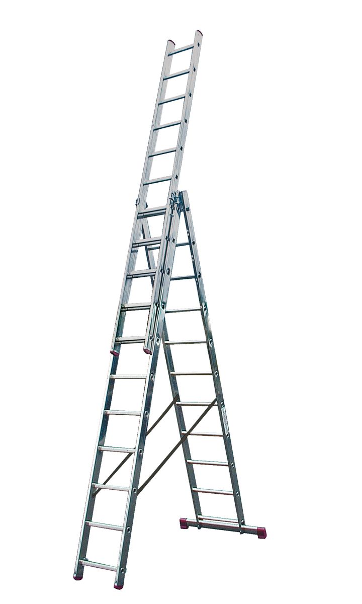Алюминиевая трехсекционная лестница с перекладинами, универсального применения - может использоваться как приставная и выдвижная лестница, или как стремянка. Прочный стальной направляющий профиль обеспечивает удобное выдвижение лестницы. Профилированные со всех сторон перекладины для безопасного подъема и спуска. Широкая поперечная траверса с двухкомпонентными заглушками увеличивает опорную площадь. Противоскользящие двухкомпонентные опорные заглушки - твердый материал обеспечивает прочное соединение с боковиной, мягкий материал обеспечивает надежное сцепление с опорной поверхностью и препятствует нежелательному скольжению лестницы. Самофиксирующиеся крюки-защелки препятствуют произвольному выскальзыванию секций при работе и транспортировке. Устойчивые к атмосферным воздействиям ремни препятствуют нежелательному раздвижению лестниц в рабочем положении.