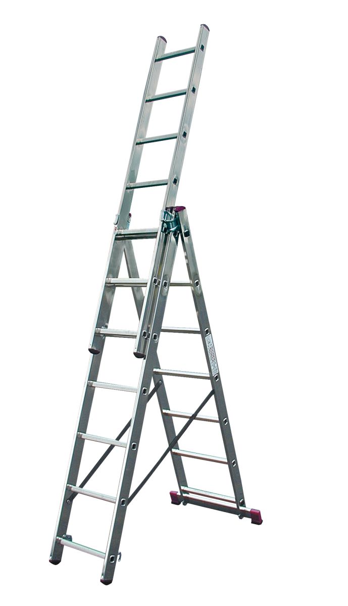 Алюминиевая трехсекционная лестница с перекладинами, универсального применения - может использоваться как приставная и выдвижная лестница, или как стремянка. Прочный стальной направляющий профиль обеспечивает удобное выдвижение лестницы. Профилированные со всех сторон перекладины для безопасного подъема и спуска. Широкая поперечная траверса с двухкомпонентными заглушками увеличивает опорную площадь. Противоскользящие двухкомпонентные опорные заглушки - твердый материал обеспечивает прочное соединение с боковиной, мягкий материал обеспечивает надежное сцепление с опорной поверхностью и препятствует нежелательному скольжению лестницы. Самофиксирующиеся крюки-защелки препятствуют произвольному выскальзыванию секций при работе и транспортировке. Устойчивые к атмосферным воздействиям ремни препятствуют нежелательному раздвижению лестниц в рабочем положении.