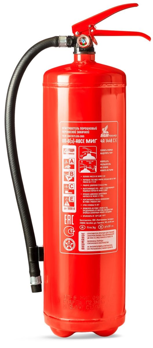 Огнетушитель порошковый закачной МИГ, предназначен для оснащения органов и подразделений по чрезвычайным ситуациям, защиты объектов народного хозяйства, транспортных средств, а также для применения в бытовых условиях в качестве первичного средства тушения пожаров классов А (твердых тлеющих материалов), В (горючих жидкостей), С (горючих газов) и Е (электроустановок, находящихся под напряжением до 1000 В. Огнетушитель не предназначен для тушения загораний щелочных, щелочноземельных металлов и других материалов, горение которых может происходить без доступа воздуха.