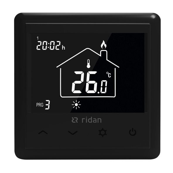 "Ridan WT-RB — электронный программируемый термостат с минималистичным дизайном, предназначенный для точного контроля и управления температурой воздуха или пола. Функция ""открытого окна"". Напрямую к термостату подключается до 15 термоэлектрических приводов TWA. Недельное программирование 52. Подключение датчика пола (опционально). Блокировка экрана. ""Защита от детей"". Калибровка датчиков температуры и настройка гистерезиса."