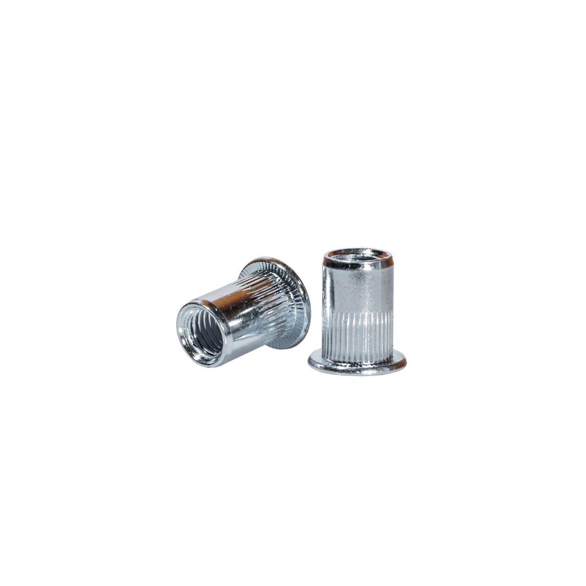 Заклепочная гайка закрытая с насечкой применяется для надежного неразъемного скрепления материалов небольшой толщины и образования в точках крепления глухих отверстий с метрической резьбой для последующего использования со шпильками или болтами.